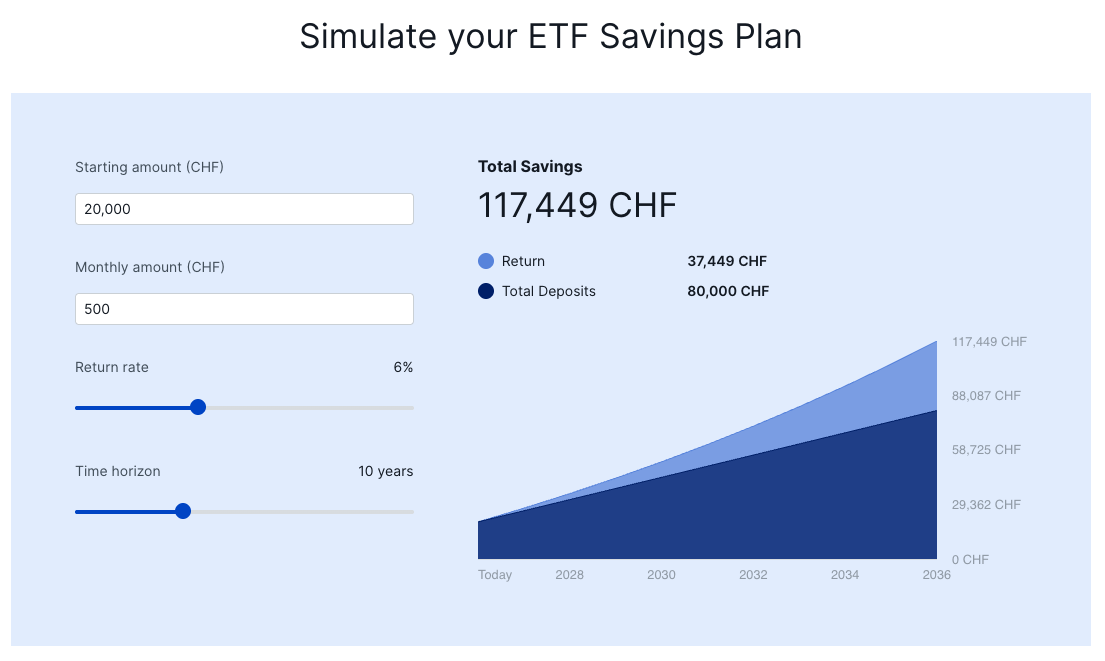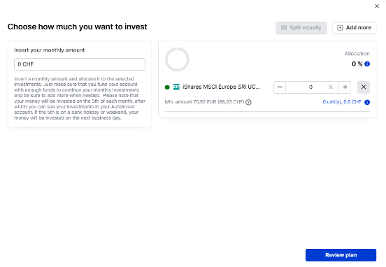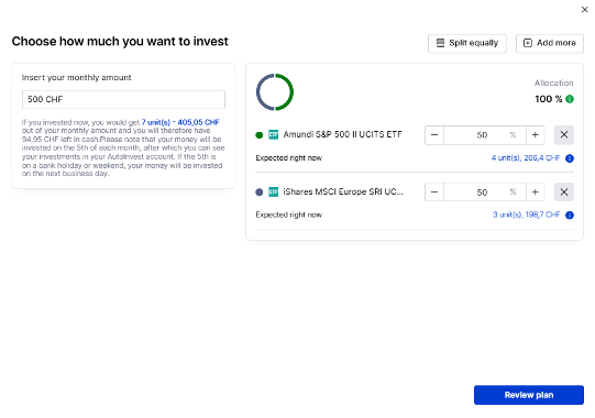 - If you want to invest into multiple ETFs on a regular basis, enter the total number you want to invest per month (e.g. CHF 500.-) and allocate the total for each ETF (e.g. CHF 250.- into the MSCI World, CHF 250.- into the S&P 500).