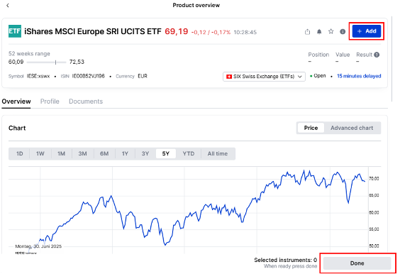 - Should you already have your investment strategy in place, it’s time to select the ETFs you want to invest in on auto-pilot. Once you found them, click “Add” in the top right corner to add them to your monthly AutoInvest.
